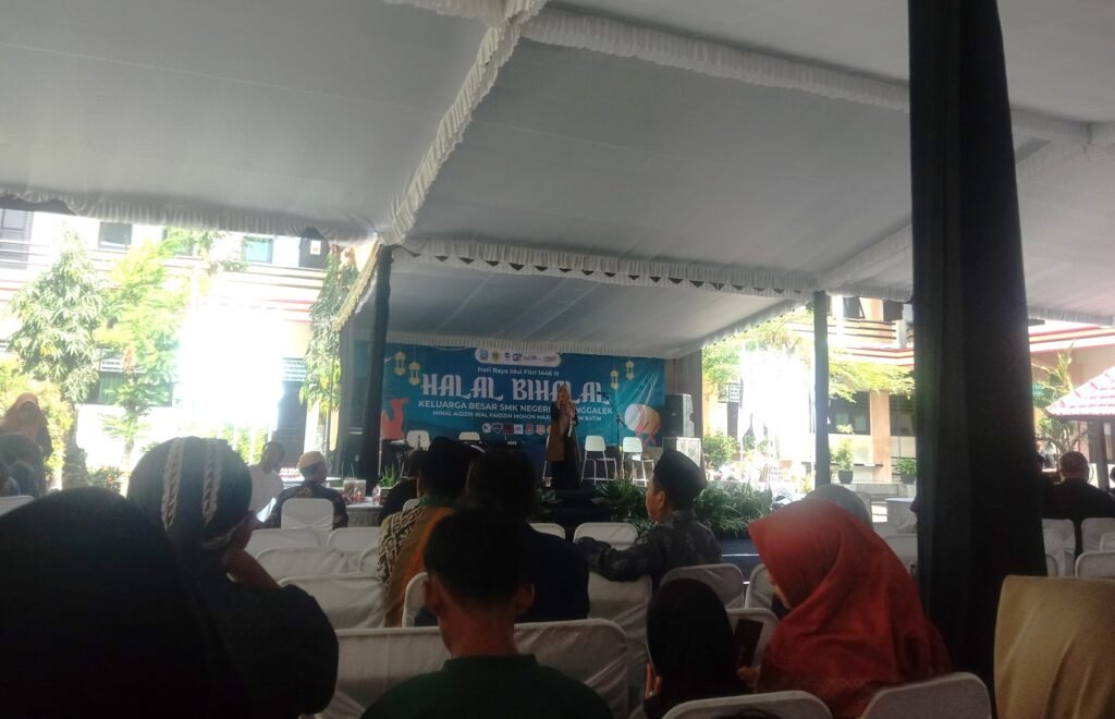 Masih dalam suasana Idul Fitri 1446 H, Guru dan Tenaga Kependidikan (GTK) SMKN 2 Trenggalek beserta keluarganya menggelar acara halal bi halal, Minggu (13/4). Acara yang menjadi tradisi tahunan ini berlangsung meriah di lapangan tengah sekolah, lengkap dengan tenda terop dan panggung khusus.