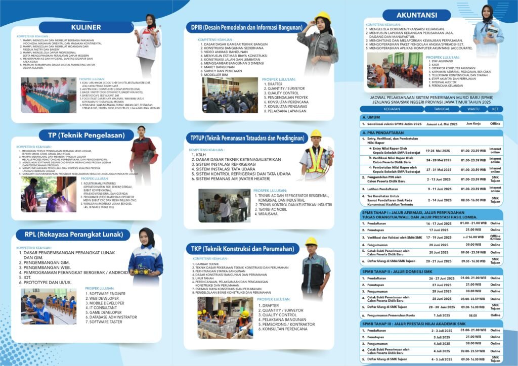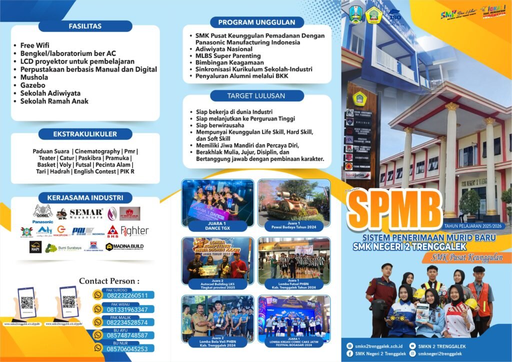 Dengan merujuk pada juknis yang ada, SMKN 2 Trenggalek telah mempublikasikan brosur SPMB yang bisa menjadi referensi informasi tentang SPMB 2025/2026 di SMKN 2 Trenggalek. Bagi calon murid yang berminat mendaftar di SMKN 2 Trenggalek, brosur SPMB 2025/2026 SMKN 2 Trenggalek dapat dilihat dan diunduh pada dokumen berikut ini (untuk versi gambar, ada di bawah versi pdf):