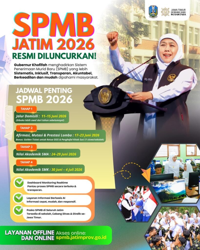 Dalam rangka untuk memastikan pelaksanaan Sistem Penerimaan Murid Baru (SPMB) Tahun Ajaran 2026/2027 yang objektif, transparan, akuntabel, berkeadilan, dan tanpa diskriminasi, serta berdasarkan hasil evaluasi pelaksanaan SPMB Tahun Ajaran 2025/2026, Dinas Pendidikan Provinsi Jawa Timur telah menerbitkan petunjuk teknis (juknis) untuk Sistem Penerimaan Murid Baru (SPMB) tahun ajaran 2026/2027. Juknis ini dipublikasikan untuk memberikan panduan yang jelas bagi sekolah, orang tua, dan calon peserta didik dalam proses pendaftaran murid baru. Juknis SPMB Jatim 2026/2027 dapat dilihat dan diunduh di bawah ini. Adapun untuk Portal Sistem Penerimaan Murid Baru (SPMB) Jawa Timur 2026, kita dapat mengunjunginya di laman: spmbjatim.net.